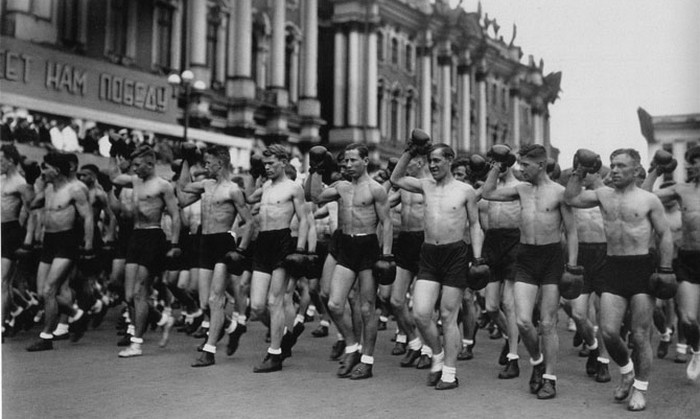 Иллюстрируют наши рассуждения три фотографии. Поликлетовский «Дорифор», юноша с копьем, образцовый универсальный атлет, гражданин и философ, алчущий правды, современный бодибилдер увешанный начиненными химией чудовищными суперменскими мышцами, думающий только о еде, химии и конкурсах маньяков суперразмеров, и довоенный парад физкультурников СССР, строй прекрасных юношей и девушек, одухотворенных мечтой… Хочется верить, что мы – православные люди, прошедшие через двух тысячелетнее обучение христианской историей, сможем отделить зерна от плевел и создать свою систему физического воспитания. Юноша с копьем ждет Христа, бодибилдер угождает сатане, отрезанные от богочеловека Христа советские физкультурники мечтали стать героями-сверхчеловеками, а нам предстоит с Божьей помощью поставить правильные акценты, беря на вооружение все лучшее что оставила нам античность, русская история, многие бесспорные достижения организации физической культуры в СССР.